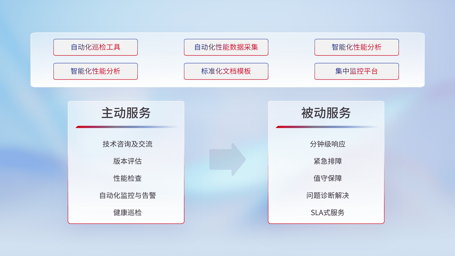 智能化工具和标准化文档,,,保障服务质量,,提供主动服务(包含技术咨询、、版本评估、、、性能检查、、自动化监控与告警、、、健康巡检)和被动服务包含(分钟级响应、、、紧急排障、、值守保障、、问题诊断解决、、、SLA服务)。。