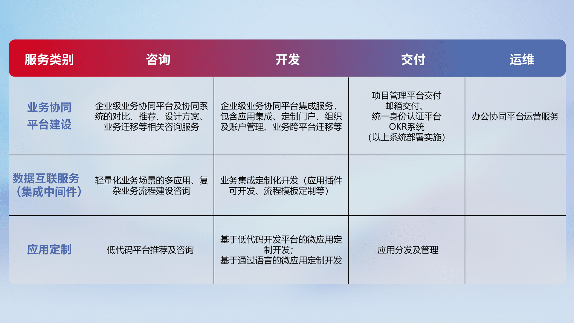 针对钉钉、、企微、、IDaas等平台级产品提供产品的规划、、、方案、、、交付、、、、定制化开发等服务,,,实现如统一协同办公、、智能客户服务、、混合会议管理、、智能数据查询、、、等业务场景,,实现数字化转型。。